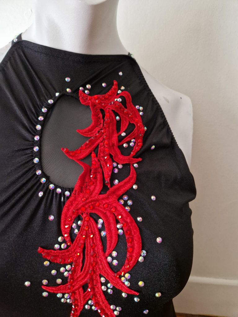 Description : Justaucorps twirling équipe dos nu rouge et noir avec guipure et strass