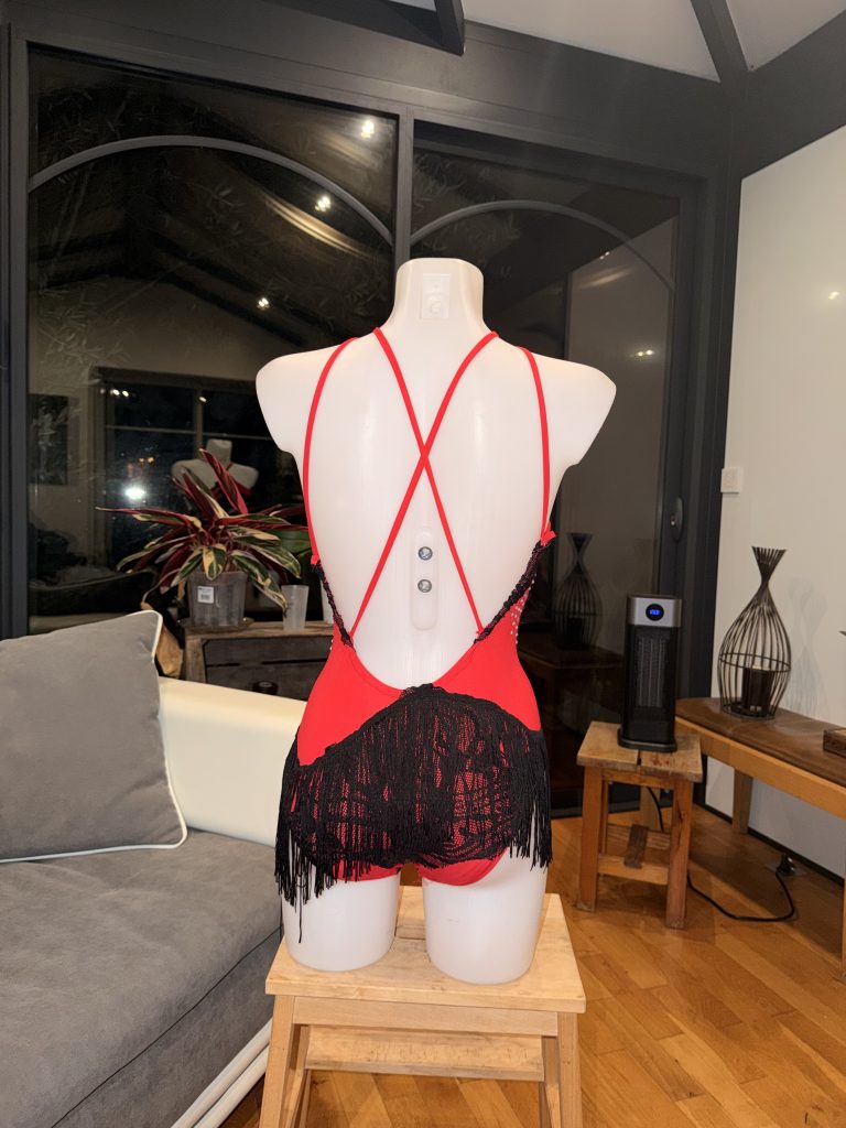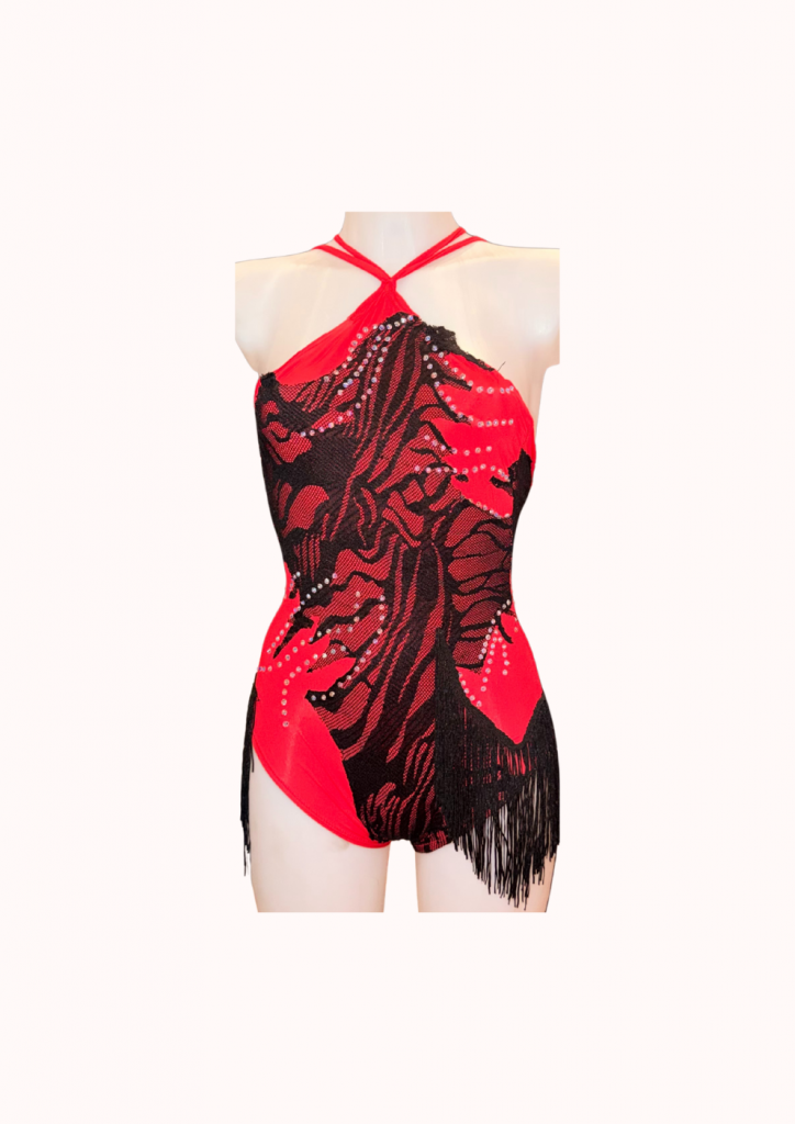 Description : Justaucorps rouge et noir avec frange + strass et dentelle